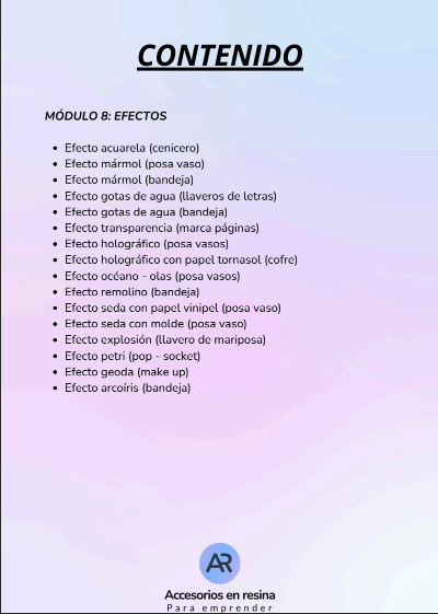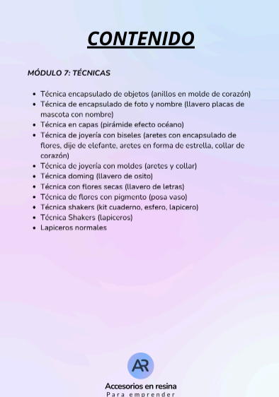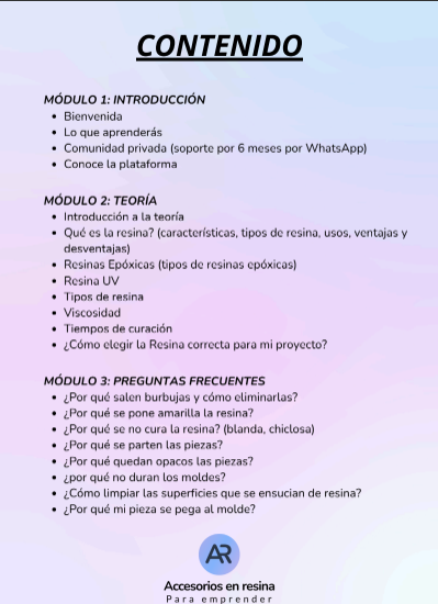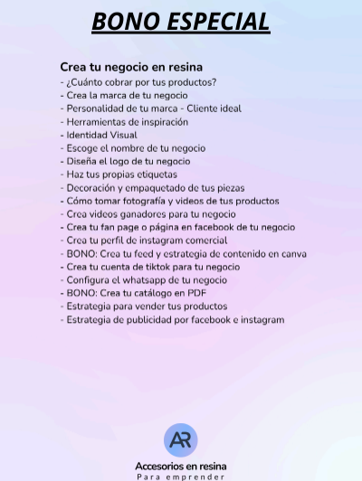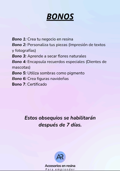 Con estos bonos, no solo aprenderás a trabajar la resina, sino también a convertir tu talento en una fuente de ingresos reales. Todo lo que necesitas para empezar a emprender con éxito está aquí, en un solo curso.