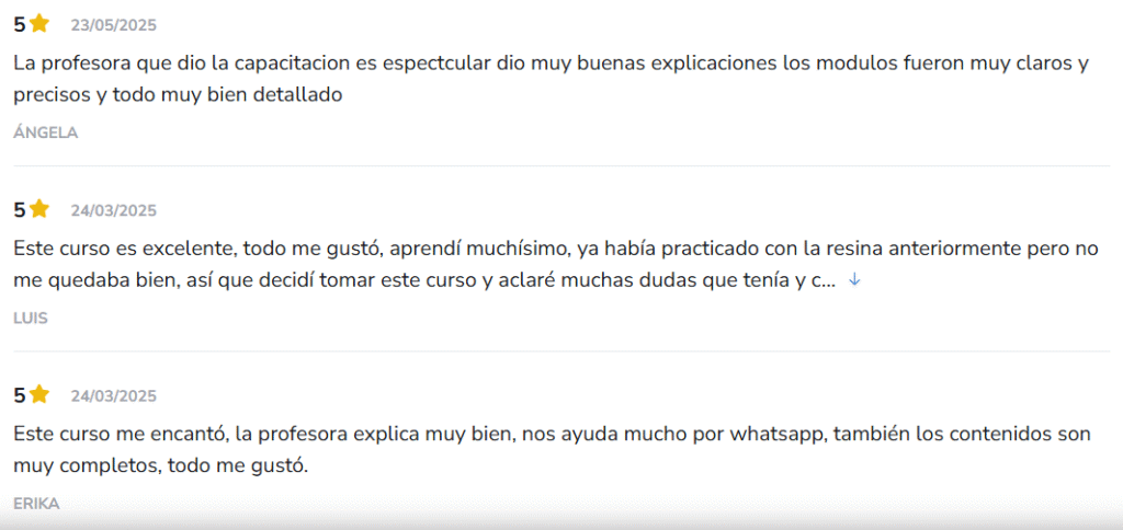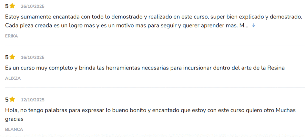 Con más de 85 clases en video, materiales de apoyo, bonos exclusivos y soporte personalizado, este curso ha ayudado a cientos de personas a descubrir su talento, desarrollar su creatividad y convertir su pasión por la resina en una fuente de ingresos reales.