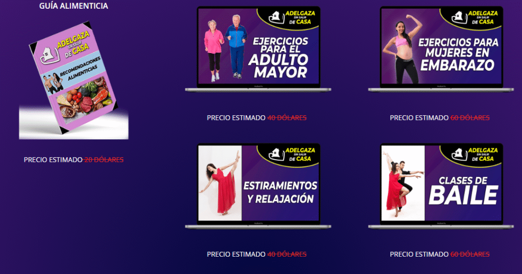 Lo mejor es que tendrás acceso a una formación completa, con rutinas fáciles de seguir, una guía de alimentación clara y varios bonos que hacen el proceso más motivador: ejercicios para adultos mayores, rutinas para embarazadas, estiramientos, relajación y hasta clases de baile. Todo está diseñado para adaptarse a tus necesidades y hacerlo desde la comodidad de tu hogar, sin entrenadores presionando ni horarios rígidos.