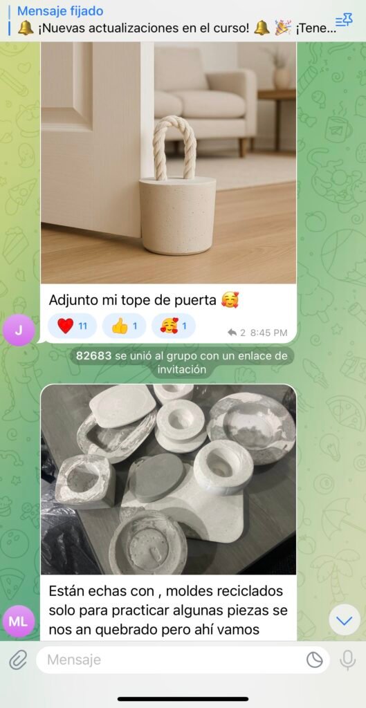 Dentro de la comunidad del curso “Piezas Decorativas en Concreto”, muchos estudiantes destacan la cercanía y el ambiente de apoyo entre los participantes. Comparten sus avances, muestran sus piezas y reciben retroalimentación de otros compañeros y de las instructoras. Esto genera motivación, inspiración y la seguridad de no estar aprendiendo solos.