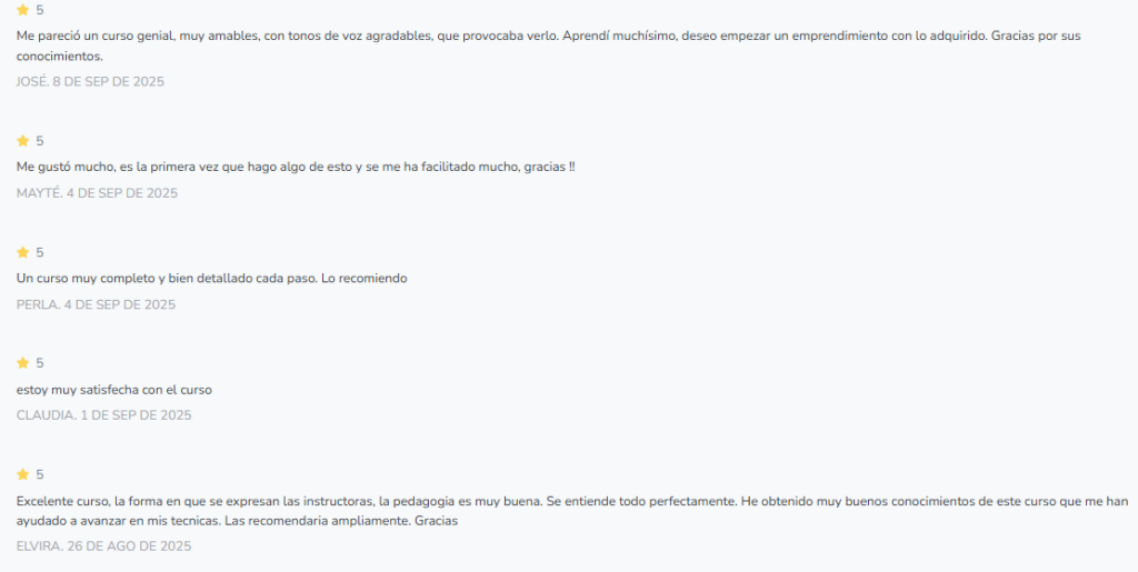En la plataforma Hotmart, los alumnos valoran la claridad de las explicaciones y la organización de los módulos. Resaltan que las clases en vídeo son fáciles de seguir y que el contenido práctico es ideal para aprender paso a paso. Además, muchos señalan que el acceso 100% online les permite avanzar a su propio ritmo sin presiones de tiempo.