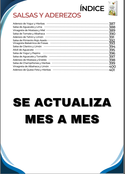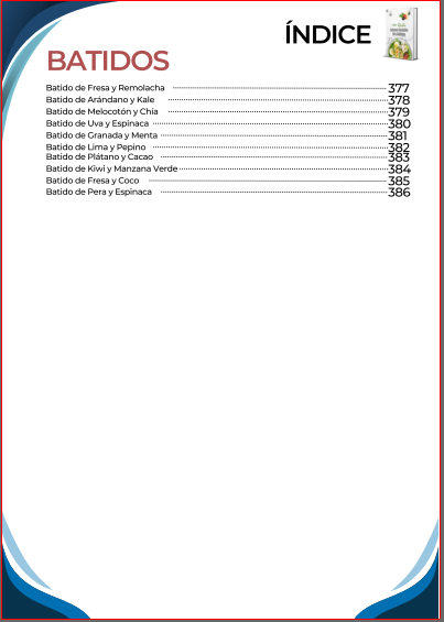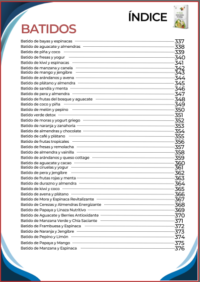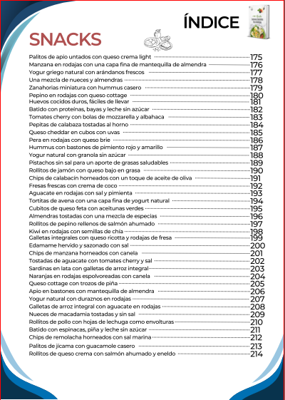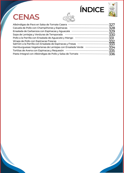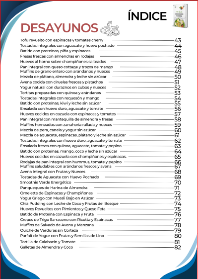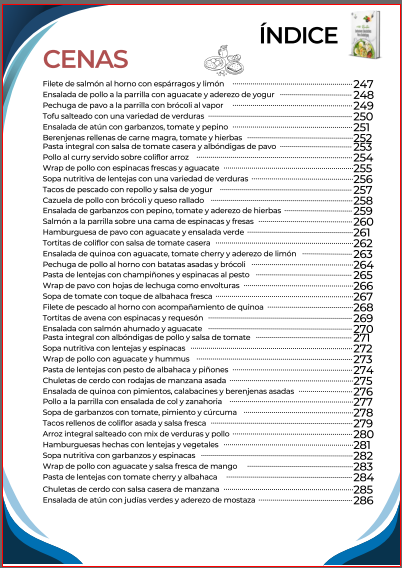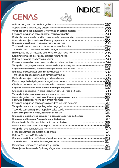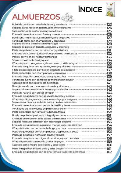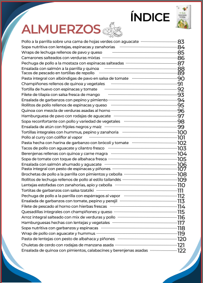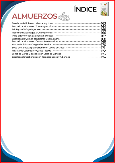 El índice inicia con una amplia selección de desayunos nutritivos y energéticos, diseñados para comenzar el día con un control adecuado de la glucosa y mantener la energía. Luego continúa con opciones de almuerzos completos y balanceados, que combinan sabor y nutrición en platos fáciles de preparar. También incluye una sección de meriendas y snacks saludables, ideales para calmar el apetito entre comidas sin descuidar la salud.